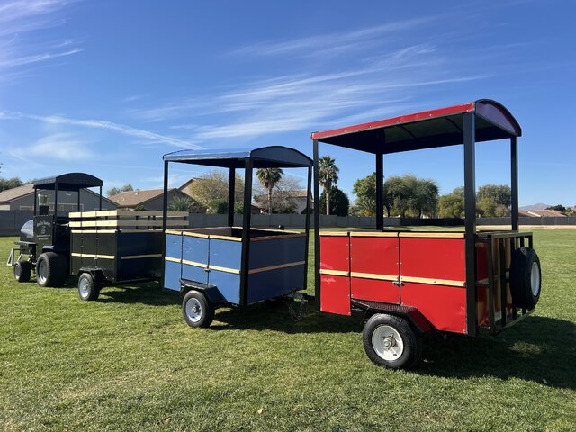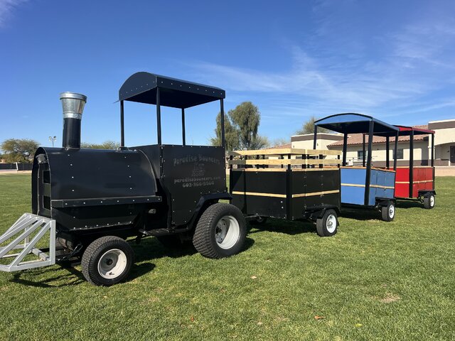 If you’re looking for a crowd-pleasing rental that’s family-friendly, highly visible, and perfect for large attendance events, the Large Deluxe Trackless Train delivers memorable rides, great photo moments, and nonstop smiles from start to finish.The train has an engineer, locomotive and 3 passenger cars. The passenger cars are designed as a coal cart, standard cart and caboose. This train can carry a total of 12 riders at once. Min 1 Hour rental within delivery area. Customers are responsible for attending the train cars and helping passangers on and off of the train.
